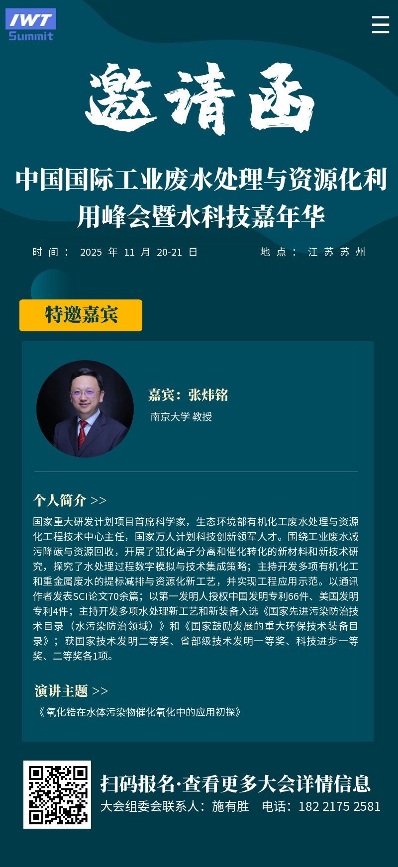 关注工业废水处理与资源化的伙伴们看这里!中国国际工业废水处理与资源化利用峰会暨水科技嘉年华,邀请到南京大学教授张炜铭作为特邀嘉宾出席~