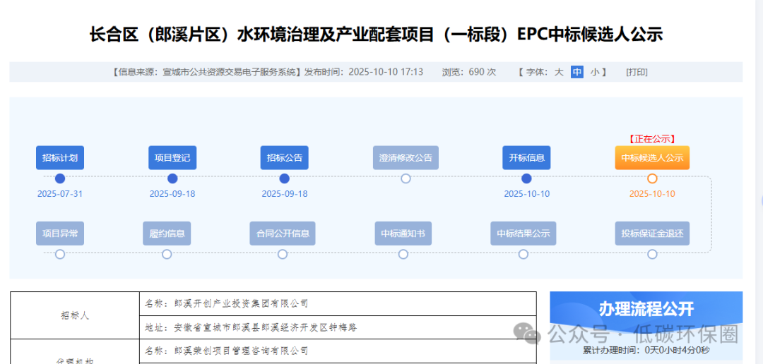 近日,中国水网从 E20 环境平台标讯采集系统 E 标通获悉,安徽省宣城市长合区(郎溪片区)水环境治理及产业配套项目(一标段)EPC 中标候选人公示发布,公示信息来源于宣城市公共资源交易电子服务系统,发布时间为 2025 年 10 月 10 日,截至公示时浏览量达 690 次,投标保证金退还累计办理时间为 0 天 0 小时 4 分 0 秒。