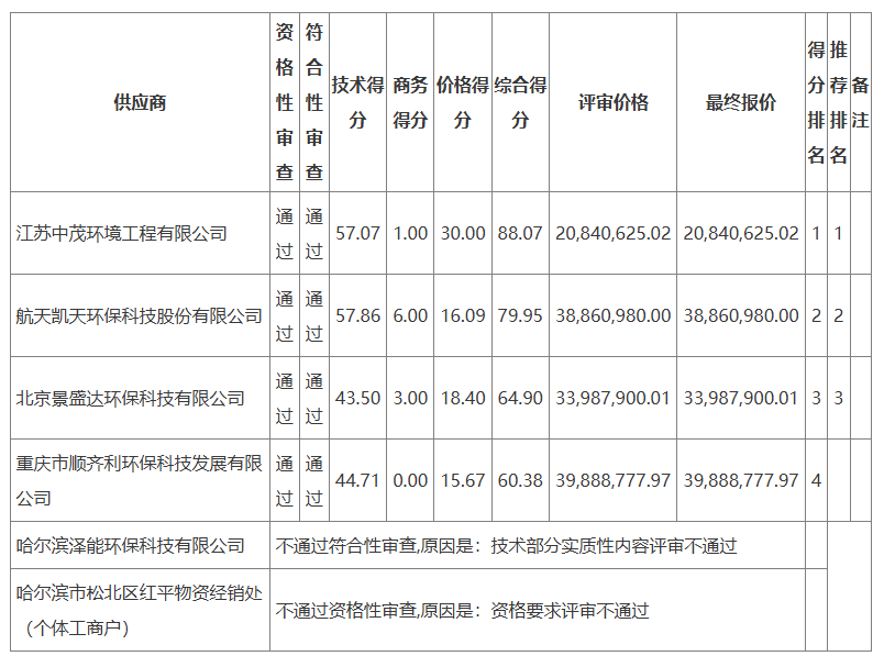 6 月 20 日:首轮中标结果公示江苏中茂环境工程有限公司以 2084.062502 万元中标,成为第一中标候选人。同期公示的 5 家参与供应商中,哈尔滨泽能环保科技有限公司因 “技术部分实质性内容评审不通过” 未通过符合性审查,哈尔滨市松北区红平物资经销处(个体工商户)因 “资格要求评审不通过” 未通过资格性审查。