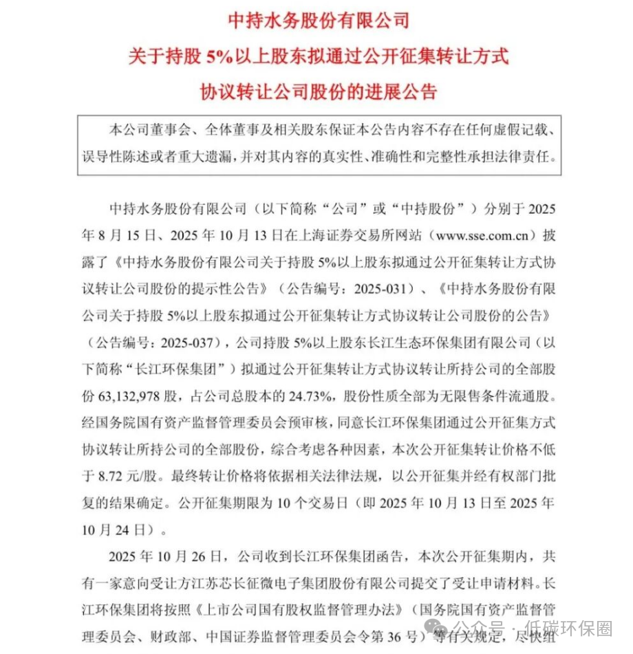 此次股权变动始于长江环保集团的公开征集转让计划。据中持股份此前公告(8 月 15 日公告编号 2025-031、10 月 13 日公告编号 2025-037),长江环保集团拟通过公开征集转让方式,协议转让其所持中持股份的全部股份,共计 6313.2978 万股,占公司总股本的 24.73%,且股份性质均为无限售条件流通股。