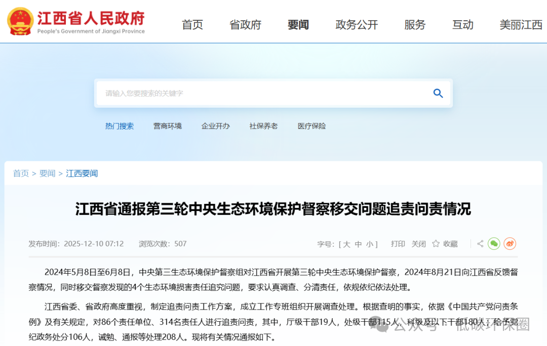 2025 年 12 月 10 日,江西省政府重磅通报第三轮中央生态环境保护督察追责问责结果。这场始于 2024 年 5 月的专项督察,最终以 86 个责任单位、314 名责任人被严肃问责收尾,其中厅级干部 19 人、处级干部 115 人、科级及以下干部 180 人,106 人受党纪政务处分,208 人获诫勉、通报等处理,以铁腕力度彰显生态保护 “零容忍” 的坚定态度。