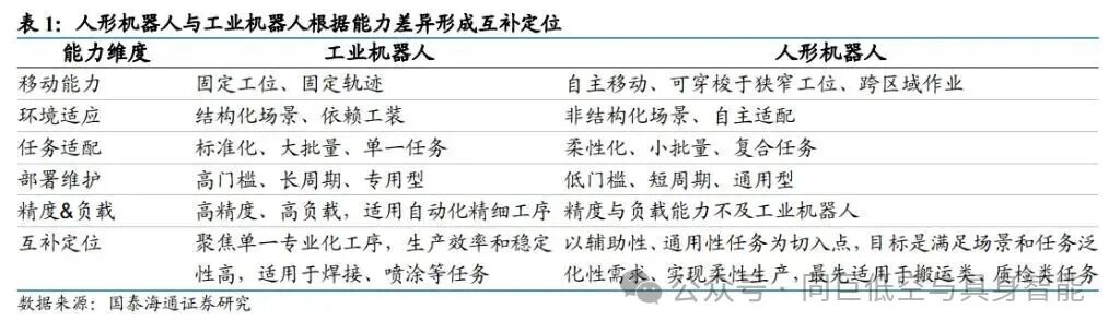 人形机器人进工厂,≠ 替代工业机器人 —— 从下表能清晰看到二者的分工: