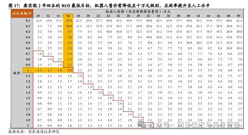 想大规模铺开,得先算清 “经济账”—— 下图显示:要实现 2 年回本的最低目标,机器人售价得降到 10 万元级,效率还要追平人工。