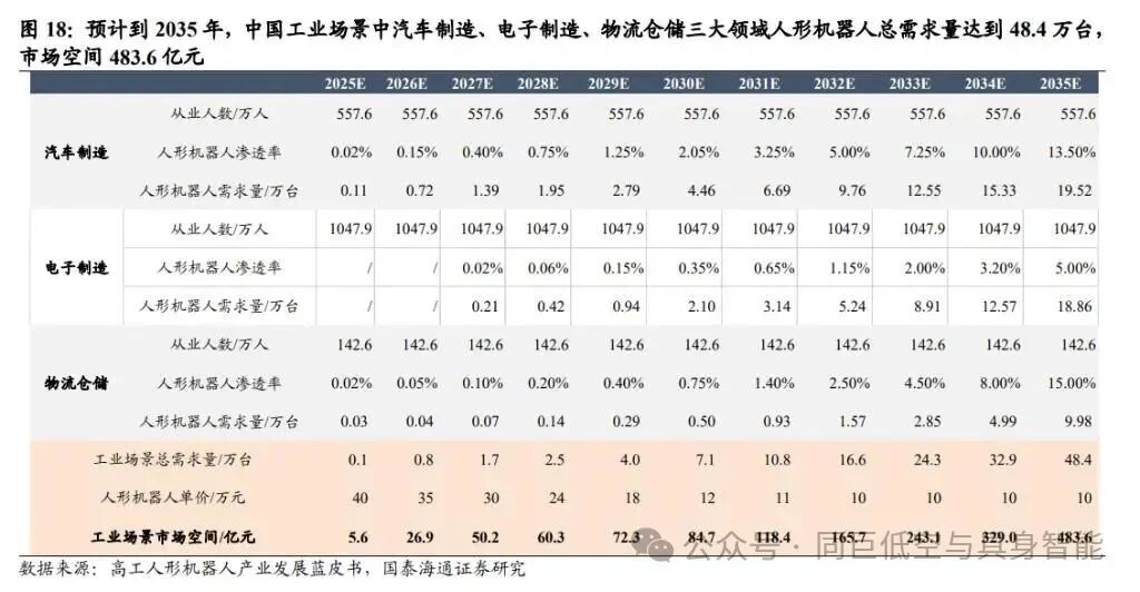 尽管有卡点,工业人形机器人的蛋糕已经显现 ——下图显示:中国汽车制造、电子制造、物流仓储三大领域,总需求将达 48.4 万台,市场空间 483.6 亿元。