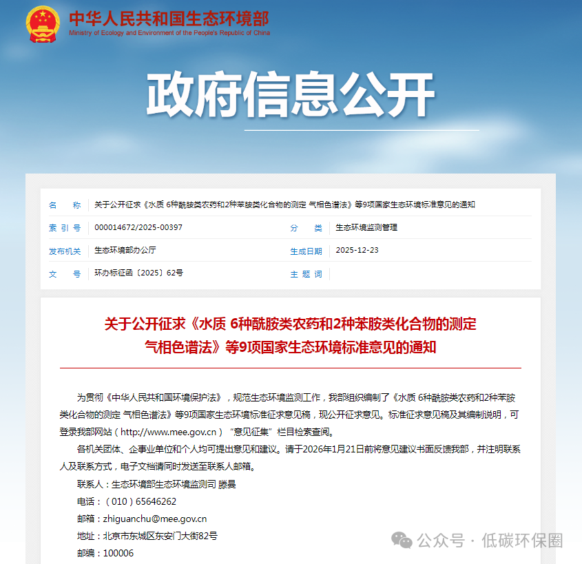 生态环境部又发新规!12 月 22 日,官方正式发布《关于公开征求〈水质 6 种酰胺类农药和 2 种苯胺类化合物的测定 气相色谱法〉等 9 项国家生态环境标准意见的通知》,覆盖水质、环境空气、固体废物三大监测领域,直接关系水处理、环境监测企业的日常运营与技术升级,意见反馈截止到 2026 年 1 月 21 日,相关单位和个人可得抓紧时间提建议!