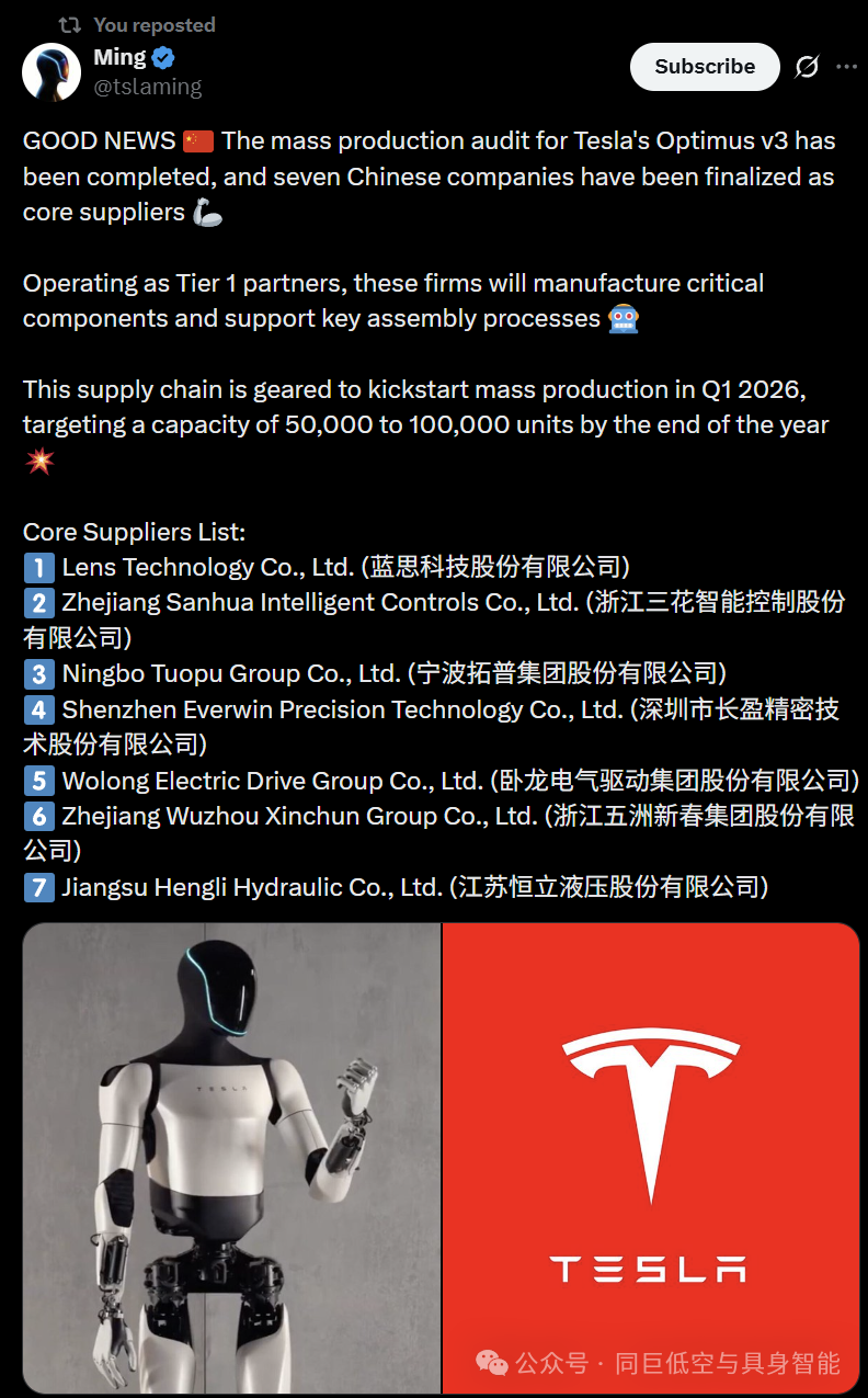 接下来的关键节点,是即将到来的 CES 展:若特斯拉能展示稳定工作的 V3 原型,将为这场 “量产赌局” 注入一剂强心针。而中国供应链能否扛住 “成本 + 规模 + 可靠性” 的三重考验,将决定 2 万美元的目标能否落地。