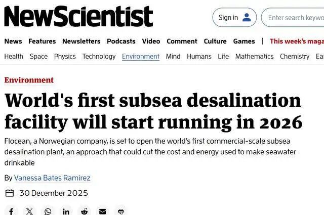 2026 年上半年,挪威 Flocean 公司将在蒙斯塔德启动全球首座商业海底海水淡化厂 “Flocean One”,靠深海静水压力 + 低污染环境,把海水淡化能耗砍 30%-50%,成本压到传统方案的 1/7-1/8。