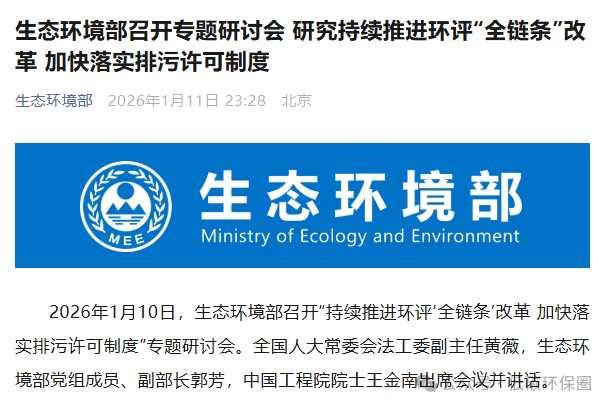 2026 年 1 月 10 日,生态环境部召开 “持续推进环评‘全链条’改革 加快落实排污许可制度” 专题研讨会,全国人大常委会法工委副主任黄薇、生态环境部副部长郭芳等出席会议并讲话。
