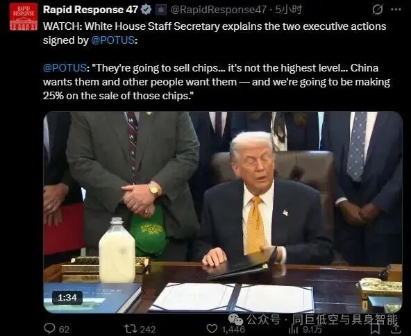 这一关税源于为期九个月的 “232 条款” 调查,表面宣称是 “激励本土芯片生产、降低对海外供应链依赖”,但特朗普在签署仪式上的表态却道破实质:“中国想要这些芯片,我们将从销售中获得 25% 的收入”。