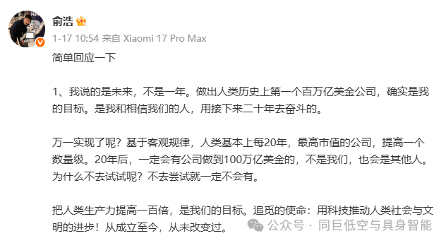 “做人类第一个百万亿美金公司”—— 追觅科技 CEO 俞浩的这句话刚冲上热搜,今天他就直接在社交平台 “硬刚” 争议:这是 20 年的目标,不是画饼。