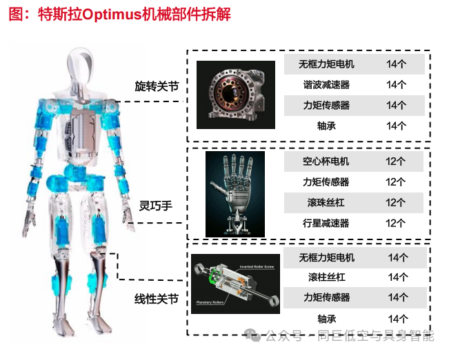 从价值量占比来看,无框力矩电机以 31% 的占比位居第一,是机器人的 “动力心脏”;行星滚柱丝杠占比 19%,承担着线性关节的驱动重任;减速器占比 16%,是控制关节灵活运转的关键;再加上灵巧手、六维力矩传感器等部件,核心零部件几乎占据了机器人硬件成本的绝大部分。