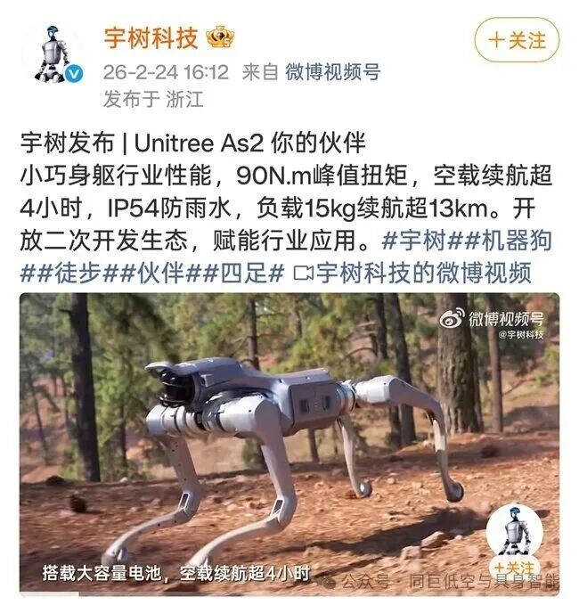 2026 年 2 月 24 日,宇树科技正式推出全新四足机器人 Unitree As2,以 “18kg 自重承载 105kg 成人站立” 的惊人表现引爆行业,标志着轻量化工业级四足机器人实现关键性能突破。