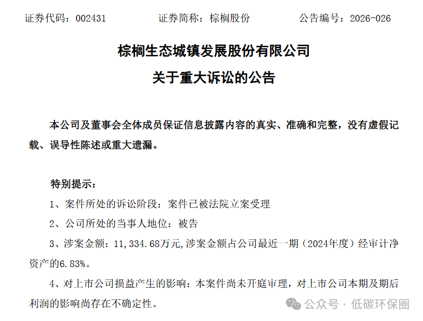 2 月 24 日,棕榈股份(002431)发布重大诉讼公告,公司及子公司梅州棕沅因 PPP 项目建设工程施工合同纠纷,被广东国沅建设起诉,涉案总金额达 1.13 亿元,占公司 2024 年经审计净资产的 6.83%,目前案件已立案尚未开庭,对公司利润影响尚存不确定性。