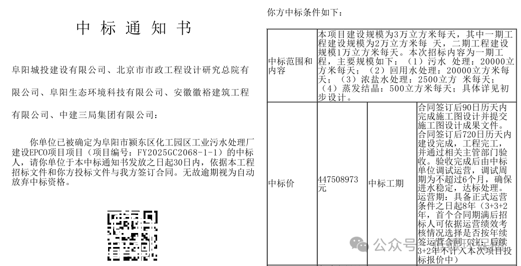 近日,阜阳市颍东区化工园区工业污水处理厂建设 EPCO 项目完成中标公示,由阜阳城投建设有限公司牵头,联合北京市市政工程设计研究总院、阜阳生态环境科技、安徽徽裕建筑、中建三局集团组成的联合体成功中标,中标金额达447508973 元。