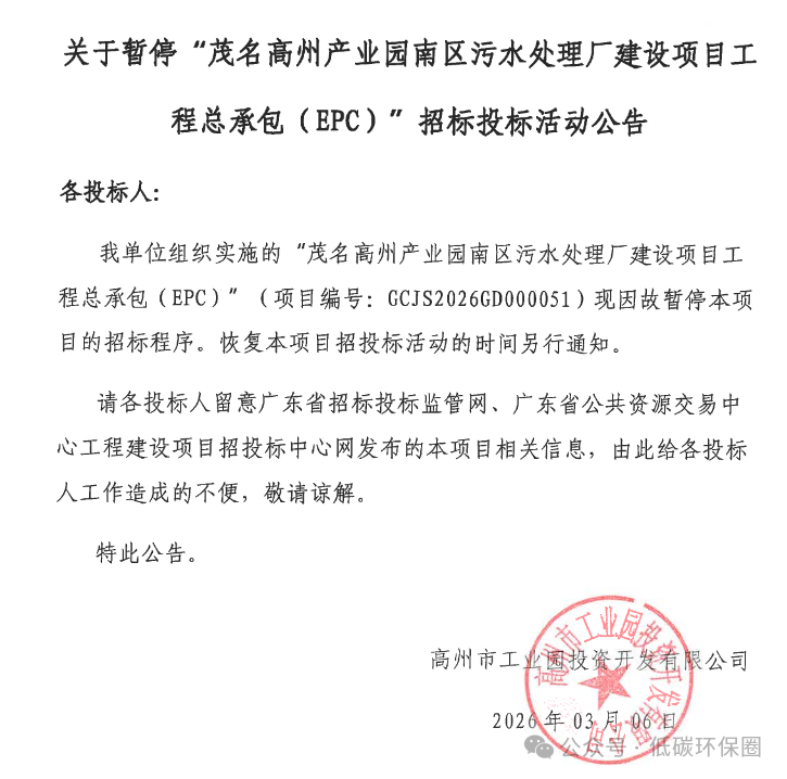 2026 年 3 月 6 日,高州市工业园投资开发有限公司发布公告,茂名高州产业园南区污水处理厂建设项目工程总承包(EPC)(项目编号:GCJS2026GD000051)正式暂停招标投标活动,恢复时间另行通知。