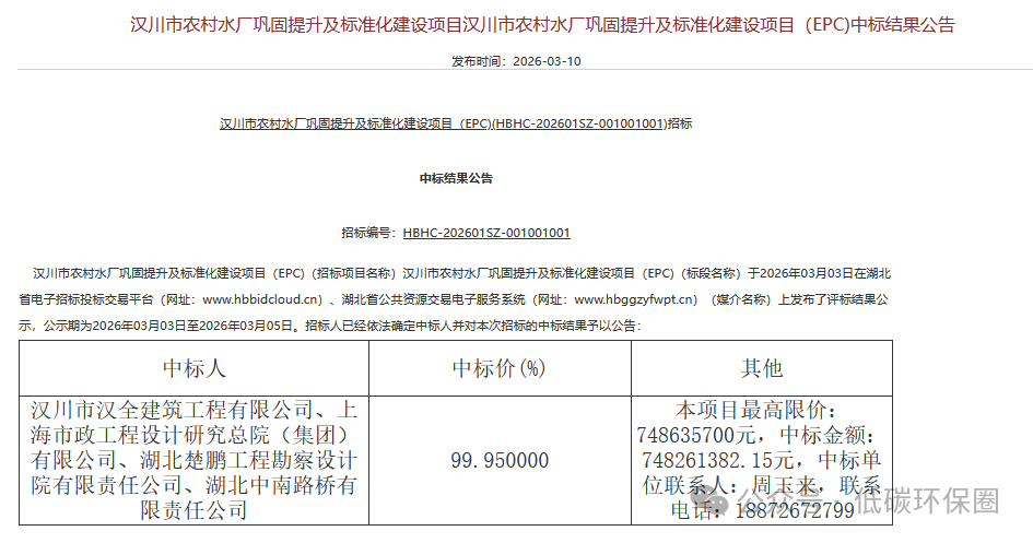 2026年3月10日,湖北省汉川市农村水厂巩固提升及标准化建设项目EPC总承包中标结果正式发布。经招标流程审核,由汉川市汉全建筑工程有限公司牵头,联合上海市政工程设计研究总院(集团)有限公司、湖北楚鹏工程勘察设计院有限责任公司、湖北中南路桥有限责任公司组成的联合体中标该项目,中标金额为748261382.15元,约合7.48亿元。