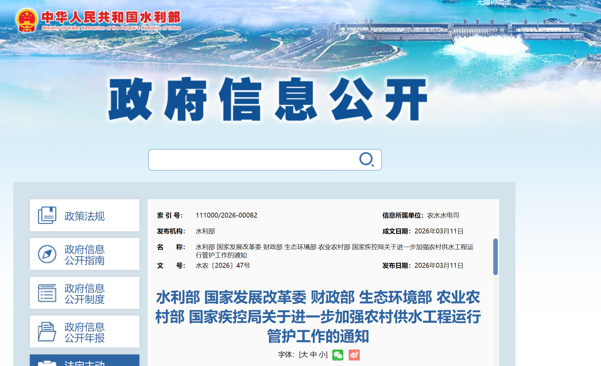 近日,水利部联合发展改革委、财政部、生态环境厅、农业农村厅、疾控局等6部门,共同印发《关于进一步加强农村供水工程运行管护工作的通知》(以下简称《通知》),聚焦农村供水“建得成、管得好、长受益”的核心目标,出台一系列硬举措,推动农村供水高质量发展。