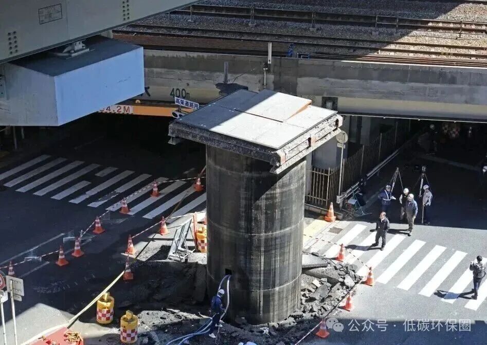 在大阪梅田最繁华的闹市区,一根直径 3.5 米、长 27 米的巨型钢管突然从地下 “顶” 了出来,最高露出地面约 13 米,几乎要戳到头顶的高架桥,现场画面像极了科幻片里的 “地底突袭”。