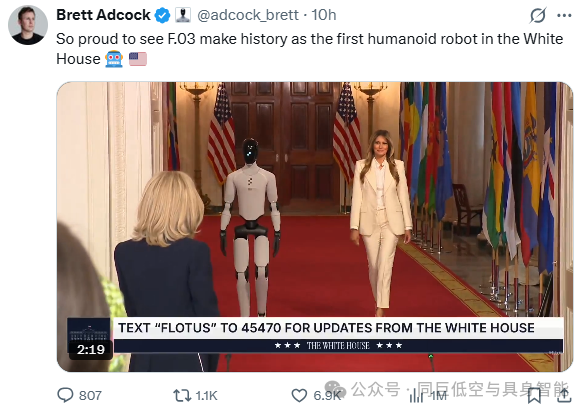 它与梅拉尼娅并肩前行的视频,很快在美国互联网上爆火,短短时间内播放量就突破百万,网友纷纷留言:“人形机器人走进白宫,AI时代真的来了”。