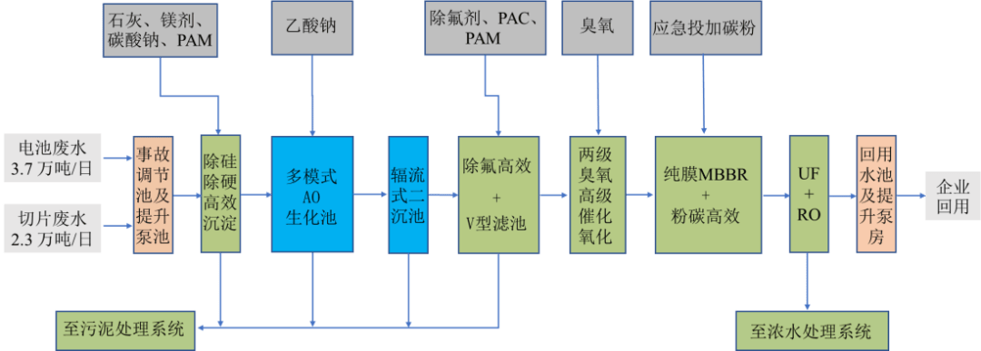 除硅采用偏铝酸钠除硅,除硬采用双碱法“NaOH+Na2CO3”除硬,采用多模式生化系统去除水中的COD、氨氮、总氮,采用专用除氟剂去除水中的氟离子,采用臭氧高级催化氧化+MBBR进一步去除水中的难降解COD,采用粉碳高密池作为应急处理工艺,采用超滤+反渗透作为水资源再生工艺,采用浓水预处理+蒸发结晶作为工业废水“近零排”工艺。